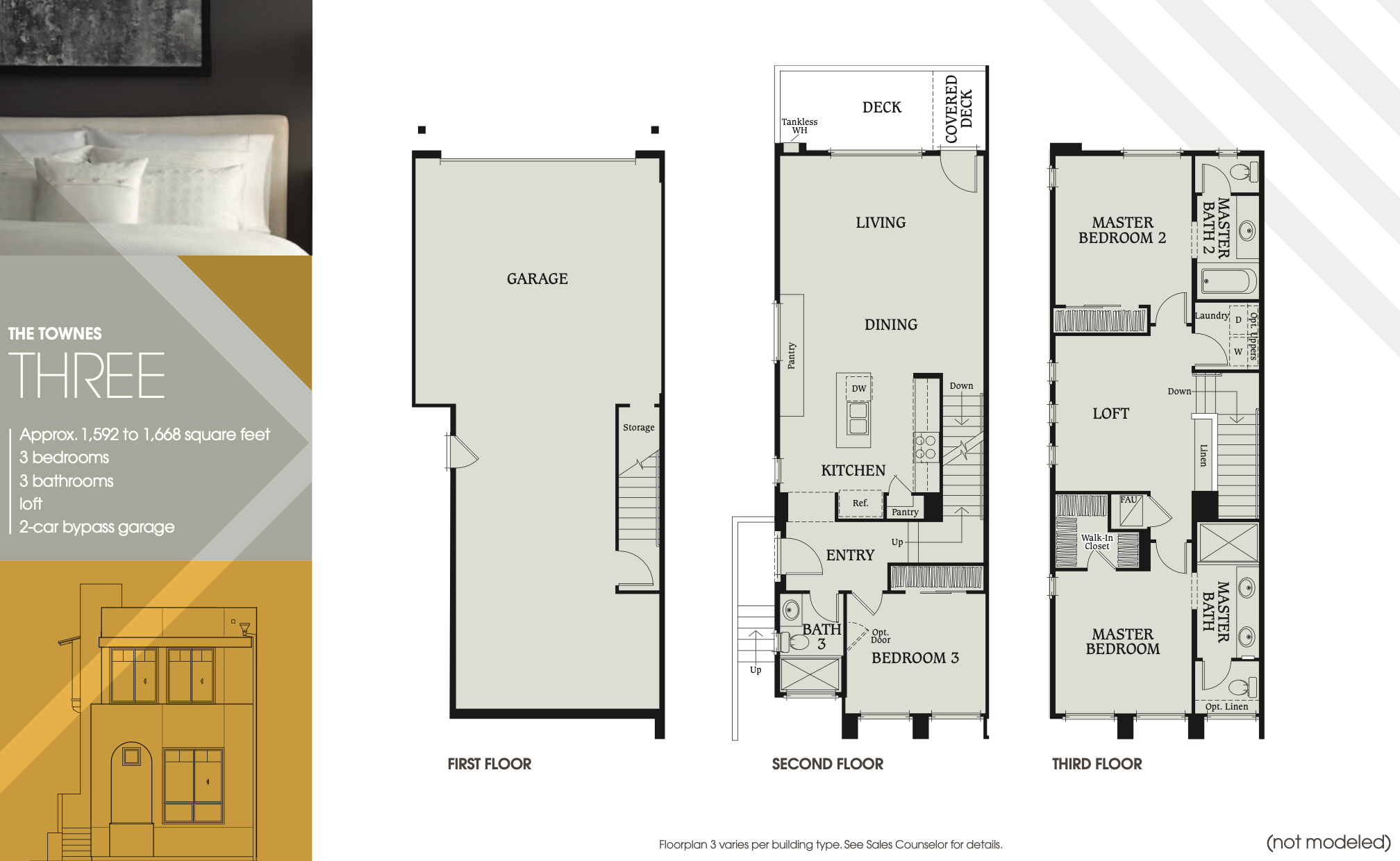 The Townes offer townhome style living with open floor plans. There is a total of 96 of these units available within the community offering 5 floor plans. The smallest unit has 1,579 square feet, 2 bedrooms and 2.5 bathrooms with a 2-car garage. The largest unit has 2,106 square feet, 4 bedrooms and 4 bathrooms with a 2-car garage. Two of the five floor plans offer a ground level bedroom with a complete bathroom.
