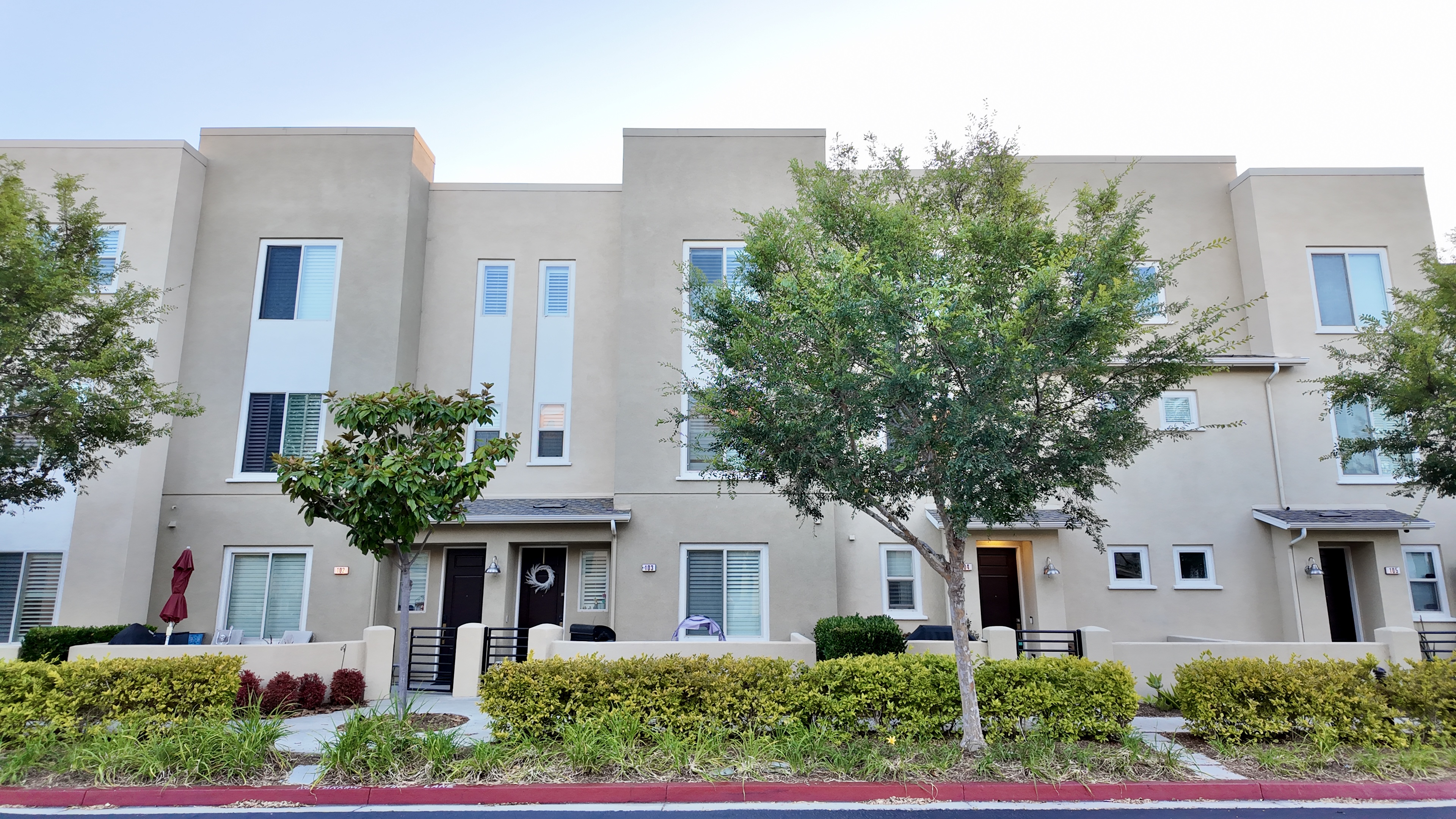 The Row units offer a traditional townhome style in a tropical exterior color scheme. There are 94 of these units available within the community offering three different floor plans. The smallest unit has 1,549 square feet, 2 bedrooms and 2.5 bathrooms with a 2-car tandem garage. The largest unit has 2,152 square feet, 3 bedrooms and 3 bathrooms, with a balcony, patio, and a 2-car side by side garage. One of the three floor plans offer a ground level bedroom with a complete bathroom.